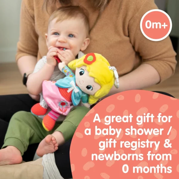 Baby Sensory Toys: The baby doll Olivia has crinkle skirt material, a rattle flower, and unique fabric textures to explore, encouraging sensory learning, fine motor skills, and early imaginative play