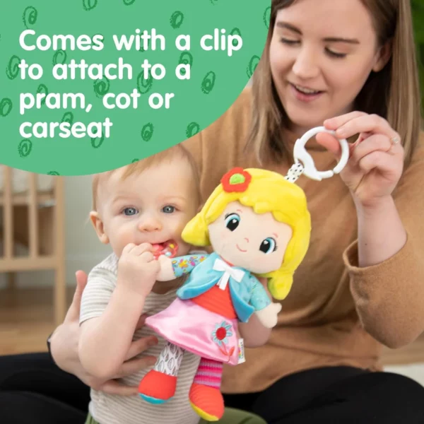 Baby Travel Essentials: Olivia has a large ring-clip to securely attach her to any stroller, car seat, activity center, and more so she can’t be dropped or thrown