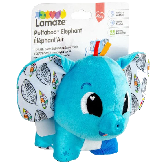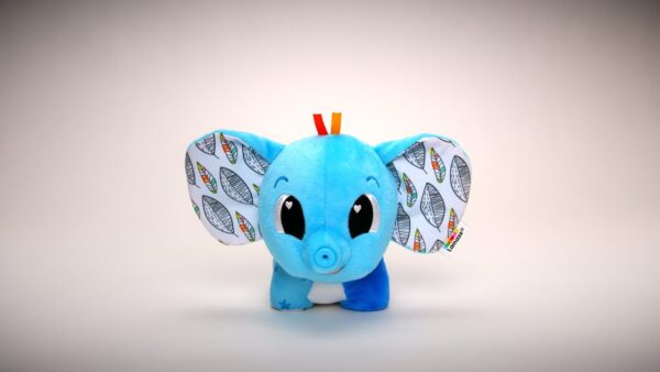 An adorable friend and an instant babysoother! Fold the crinkly ears over the eyes for a game of peek-a-boo. Explore the fascinating fabric textures and then give it a squeeze to hear it squeak. But it doesn’t just squeak, the trunk also blows a puff of air for a gentle distraction that quickly turns tears into giggles!